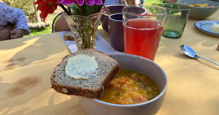 Aus den reichlich gefüllten Erntedank-Körbchen, die die Kinder in den Tagen vor dem Fest mitbrachten, wurde am Morgen gemeinsam eine duftende Gemüsesuppe gekocht. Am Mittag waren die Eltern dazu eingeladen, diese gemeinsam mit den Kindern und Erzieherinnen im Freien zu genießen. Dabei gab es selbstgebackenes Brot aus dem Kindergartenalltag. Im Anschluss durfte auch ein bunter Obstteller nicht fehlen. Vor allem die Kinder ließen sich Zwetschgen, Äpfel, Birnen, Trauben & weiteres Obst gut schmecken.
